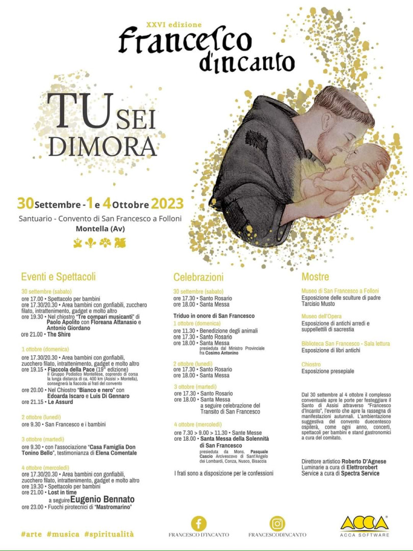 MONTELLA (AVELLINO) – Si riaprono le porte del monumentale Convento San Francesco a Folloni di Montella (AV), da sabato 30 settembre a mercoledì 4 ottobre, in occasione della 26esima edizione di ‘Francesco d’Incanto’, per le ricorrenti celebrazioni del Santo di Assisi, che anche quest’anno ospiterà concerti, spettacoli per bambini e stand gastronomici. Molte le iniziative previste all’interno dell’edificio francescano, monumento religioso duecentesco e incorniciato dall’imponente scenario naturale dei Monti Picentini, all’insegna di arte, musica e spiritualità. L’evento è promosso dal Comitato Festa ‘Francesco d’Incanto’ presieduto da Maurizio Picariello, con la direzione artistica di Roberto D’Agnese per Omast Eventi e sotto la guida di Fra Luigi Carillo e Fra Mario Ravanni.